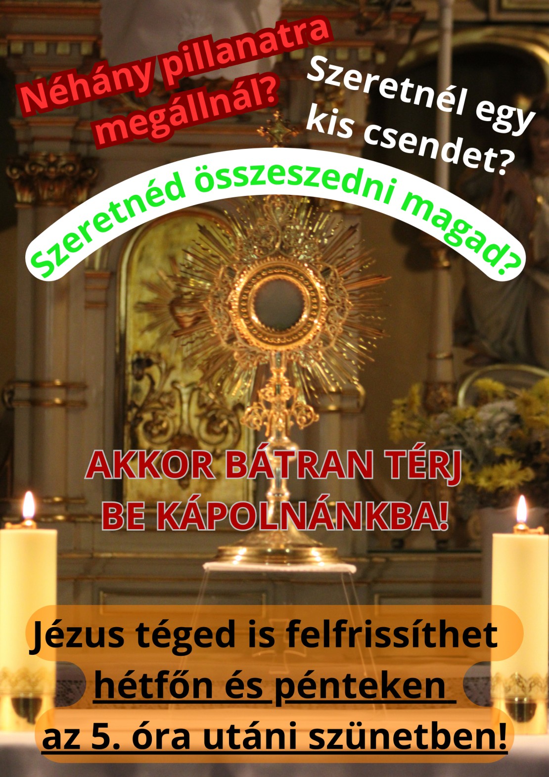 Lehetőség nyílik az elcsendesedésre, Jézussal való beszélgetésre, a Nála való erőgyűjtésre a Kápolnánkban.