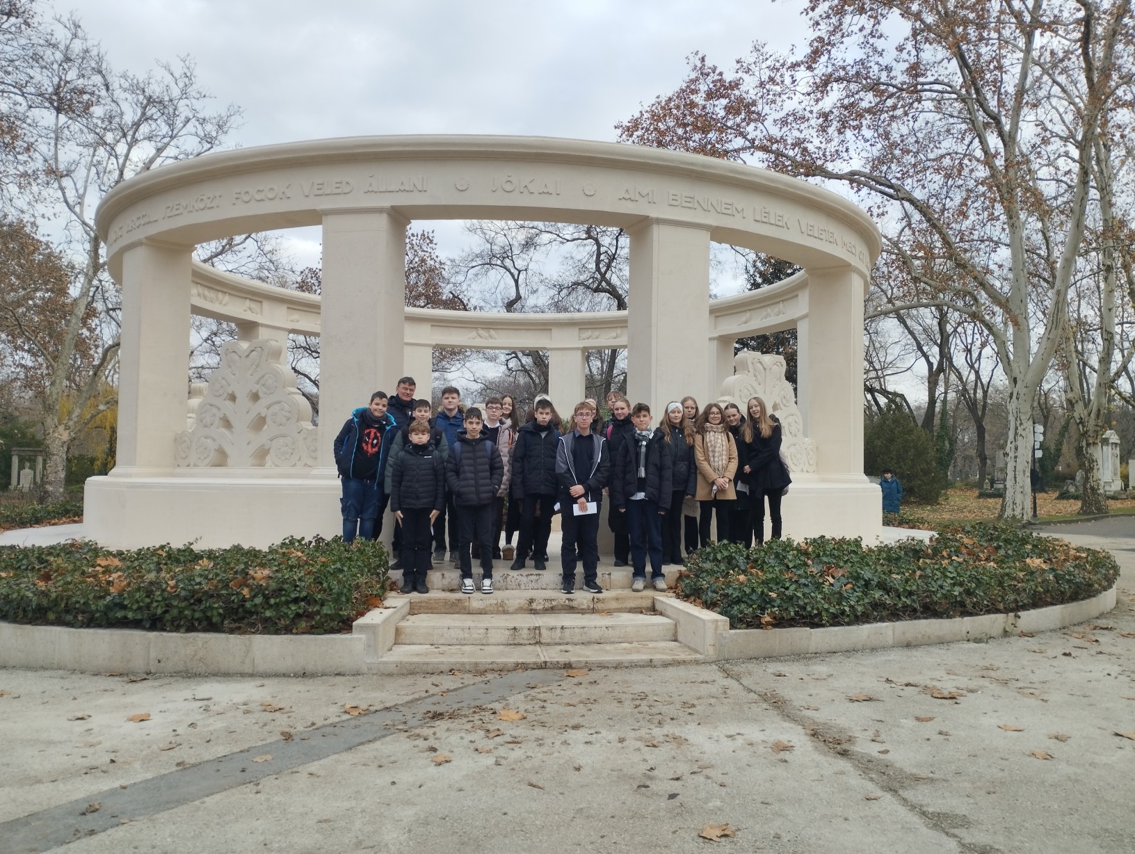 Az előadás előtt meglátogatták a Fiumei úti temetőben a 200 éve született Jókai Mór síremlékét, a tisztelet kis koszorúját helyeztek el Ady Endre és József Attila sírjára.