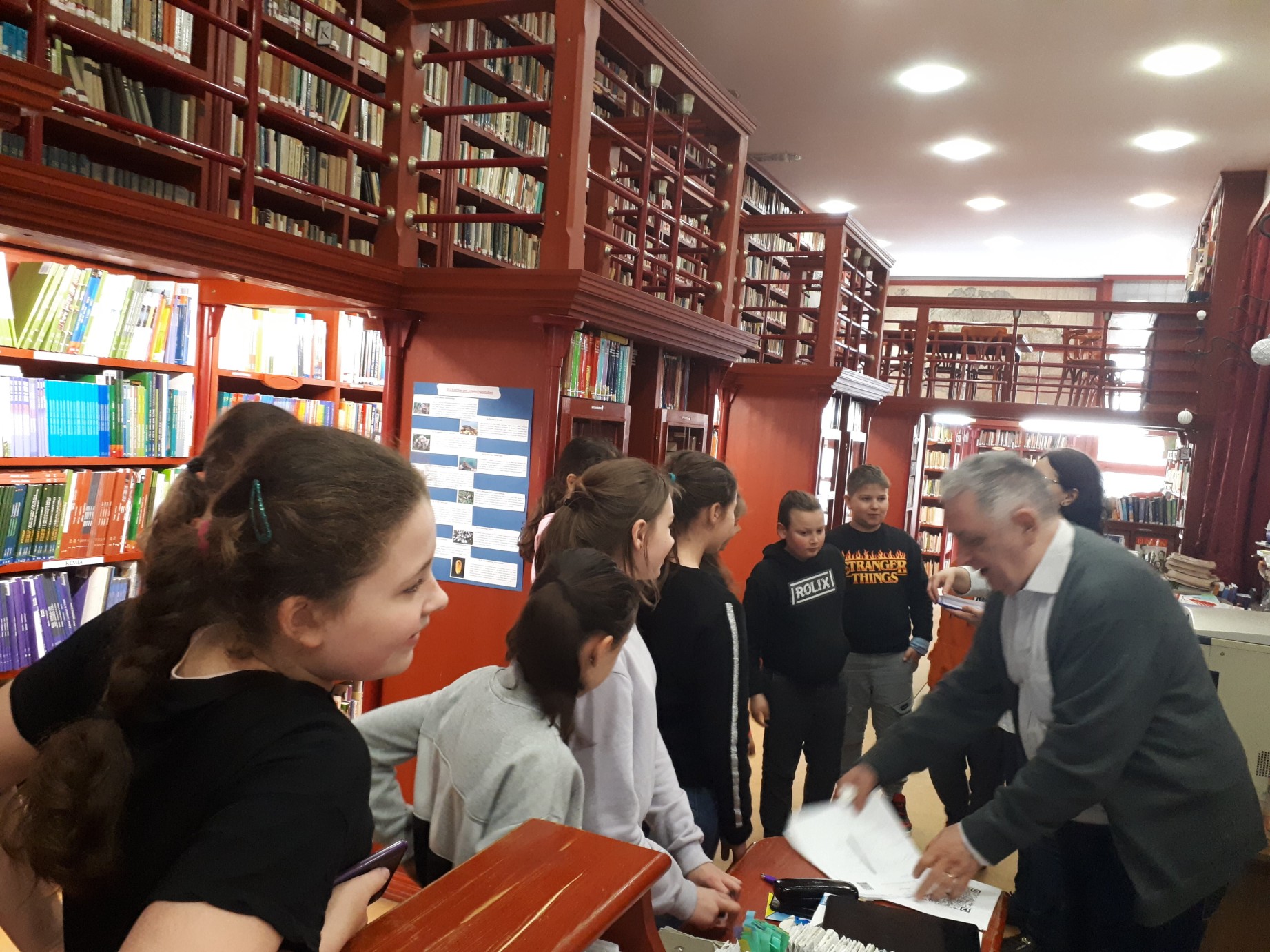 "Szabados Zsolt, Kiss István tanár urak, Brilláné Nagy Viktória tanárnő és segítő társaik, korunk két nagy kihívását, a mesterséges intelligenciát, és a QR kód lehetőségeit mutatták be előadások, képek, zenehallgatás, játékos, izgalmas felkutatós feladatok segítségével. Korunk nagy kérdése a mesterséges intelligencia. A ma emberének, főleg a fiatalságnak, diákoknak nagyon tisztában kell lennie ezzel a problémával. Probléma, ha arra gondolunk, hány ember munkája szűnik meg általa. Adomány, ha úgy fogjuk fel, hogy bármilyen problémát meg tud majd oldani helyettünk. Ezeket a kérdéseket járta körbe két 11. B-s diák, Szűcs Máté és Lukács Levente, akik 30 perces bemutatót készítettek a ma használatos MI alkalmazásokról. A jelenlévők nagy érdeklődéssel hallgatták az előadást, kérdésekkel bombázták az előadókat.