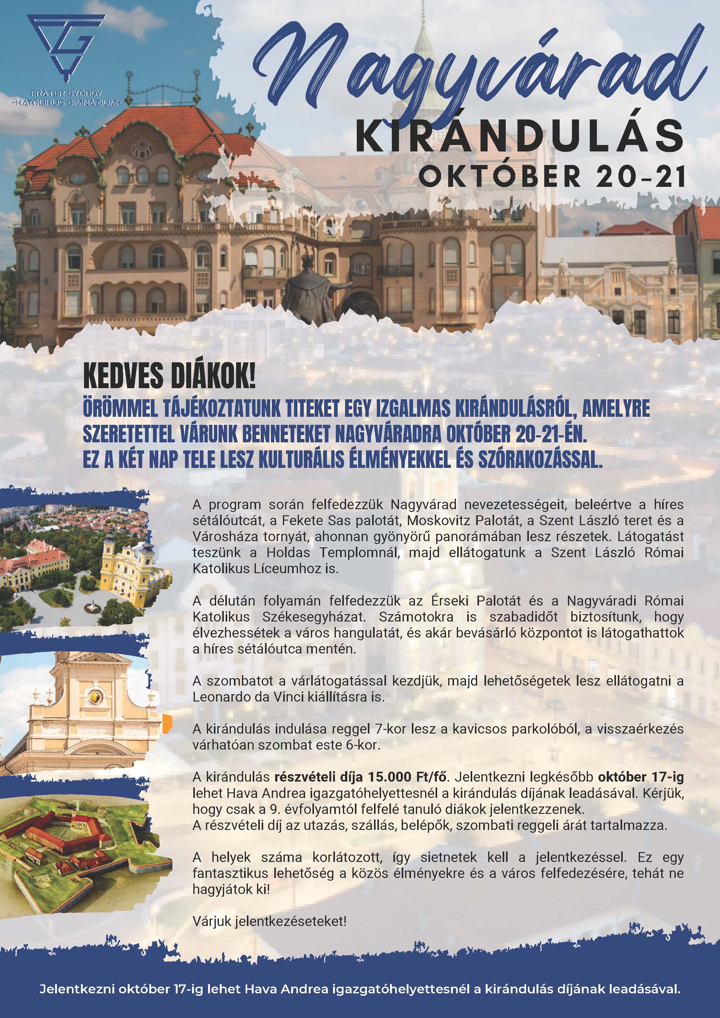 Az utazás részletes programja és a költségek a mai naptól elérhetők a honlapunkon, tanáraitoknál, valamint a Facebook oldalunkon. A jelentkezés 40 ezer forint előleg befizetésével történik OKTÓBER HÓNAP FOLYAMÁN! Bár az utazásig még majdnem egy félév hátravan, jelentkezzetek mielőbb, hogy biztosítsátok helyeteket ezen az izgalmas utazáson! Bővebb információkért és a jelentkezéshez szükséges dokumentumokért keressétek tanáraitokat.