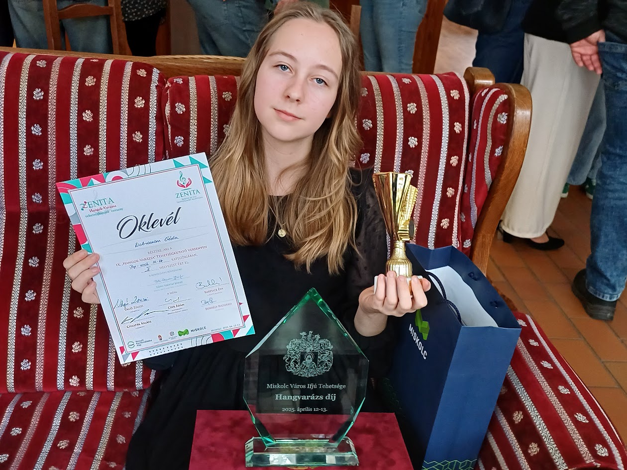 Döbröczöni Véda 6.B osztályos tanuló a Hangok Varázsa tehetségkutató versenyen országos II. helyezést ért el a 12-14 éves Pop kategóriában. Ezzel elnyerte a Miskolc Város Ifjú Tehetsége különdíjat is. Gyönyörű eredményéhez szívből gratulálunk!