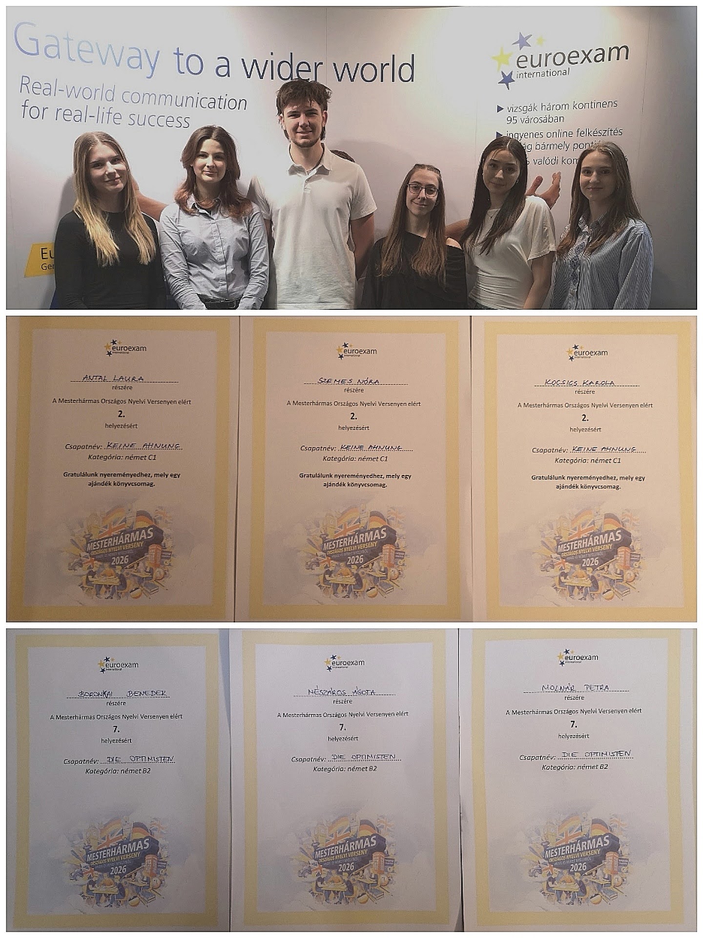 A tegnapi napon került sor az Euroexam által szervezett országos verseny döntő fordulója, amit Budapesten rendeztek. A versenyre közel 5000-en neveztek, de a 2. forduló után a regionális központokból csak a legjobbak juthattak a döntőbe, ahol iskolánk 2 csapata is kiemelkedően szerepelt. A B2-es kategóriában 7. helyezést ért el csapatunk ( Boronkai Benedek, Molnár Petra, Mészáros Ágota 12.a), a C1-es kategóriában pedig 2. helyezettek lettek diákjaink (Antal Laura 11.a, Kocsis Karola 11.a, Szemes Nóra 12.b)