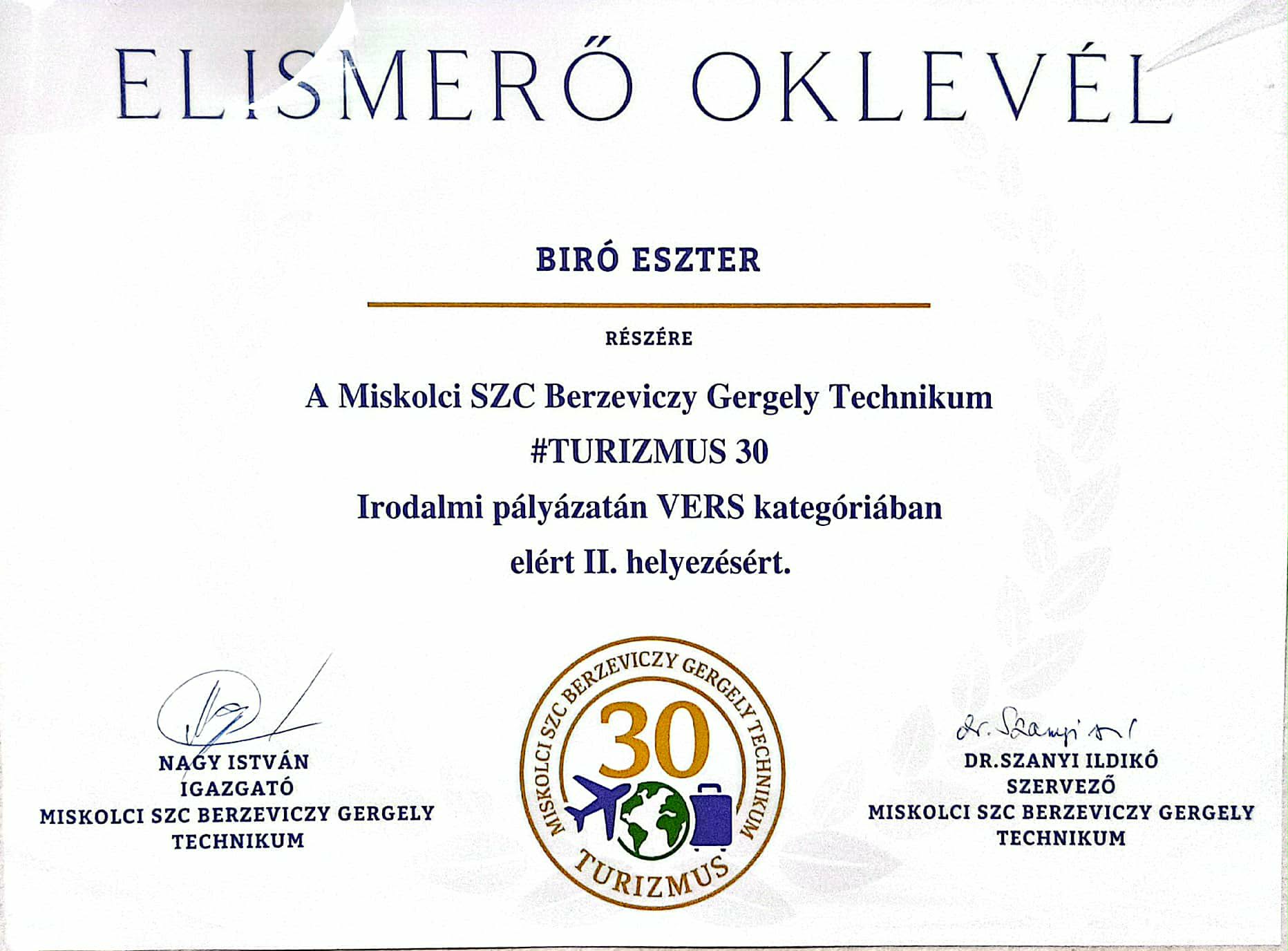 Biró Eszter, iskolánk 7.A osztályos tanulója is benyújtott egy pályamunkát, mellyel vers kategóriában a 2. helyezést érte el.