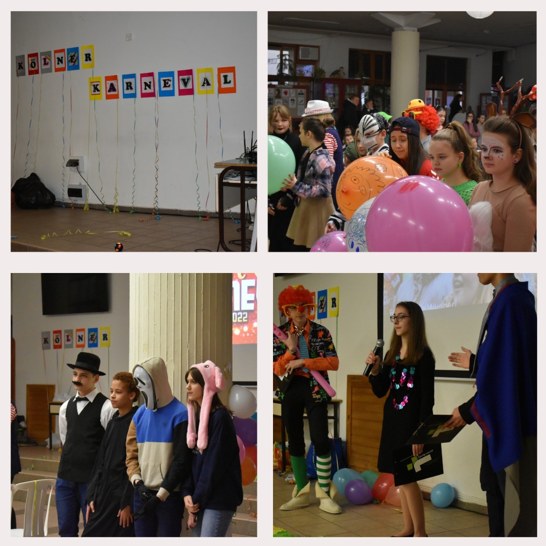 Különféle jelmezekbe öltözve, a karneváli forgatag hangulatát idézve vonultunk be a közönség elé. Ezt követően 3-4 fős csoportokra osztva vette kezdetét a vetélkedő. Változatos, érdekes, ügyességi és rajzos feladatokat kapunk a 7.-8. évfolyam németeseitől.