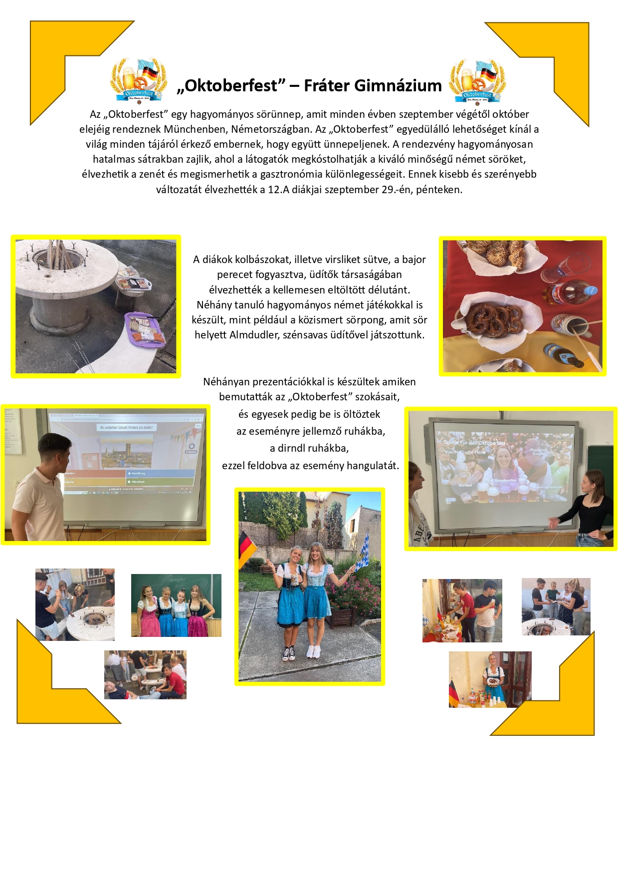 Különféle jelmezekbe öltözve, a karneváli forgatag hangulatát idézve vonultunk be a közönség elé. Ezt követően 3-4 fős csoportokra osztva vette kezdetét a vetélkedő. Változatos, érdekes, ügyességi és rajzos feladatokat kapunk a 7.-8. évfolyam németeseitől.