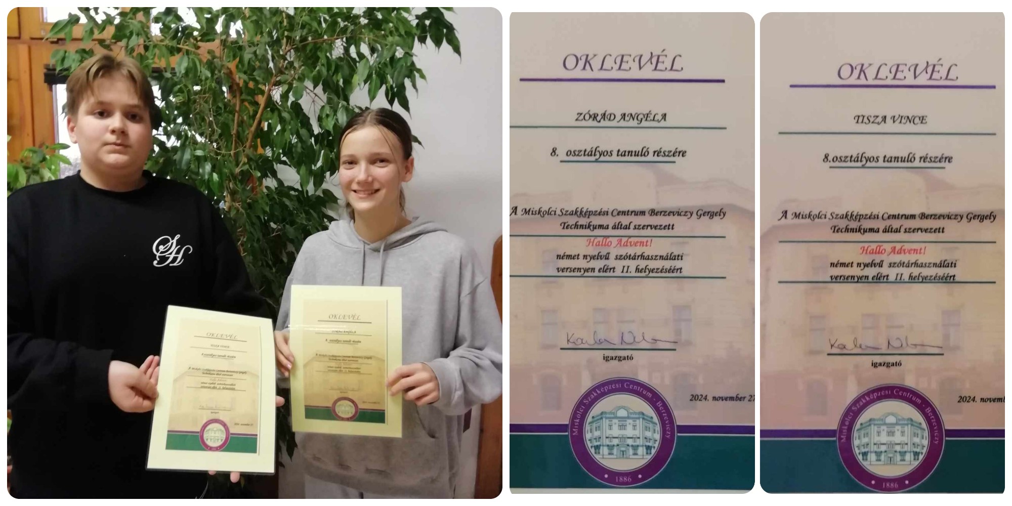 Mágori Bíborka, 12.c osztályos tanuló, a Miskolci Egyetem Bölcsészet- és Társadalomtudományi Kara által szervezett Mikulásnapi fordítóversenyen (német nyelv) III.helyezést ért el.
