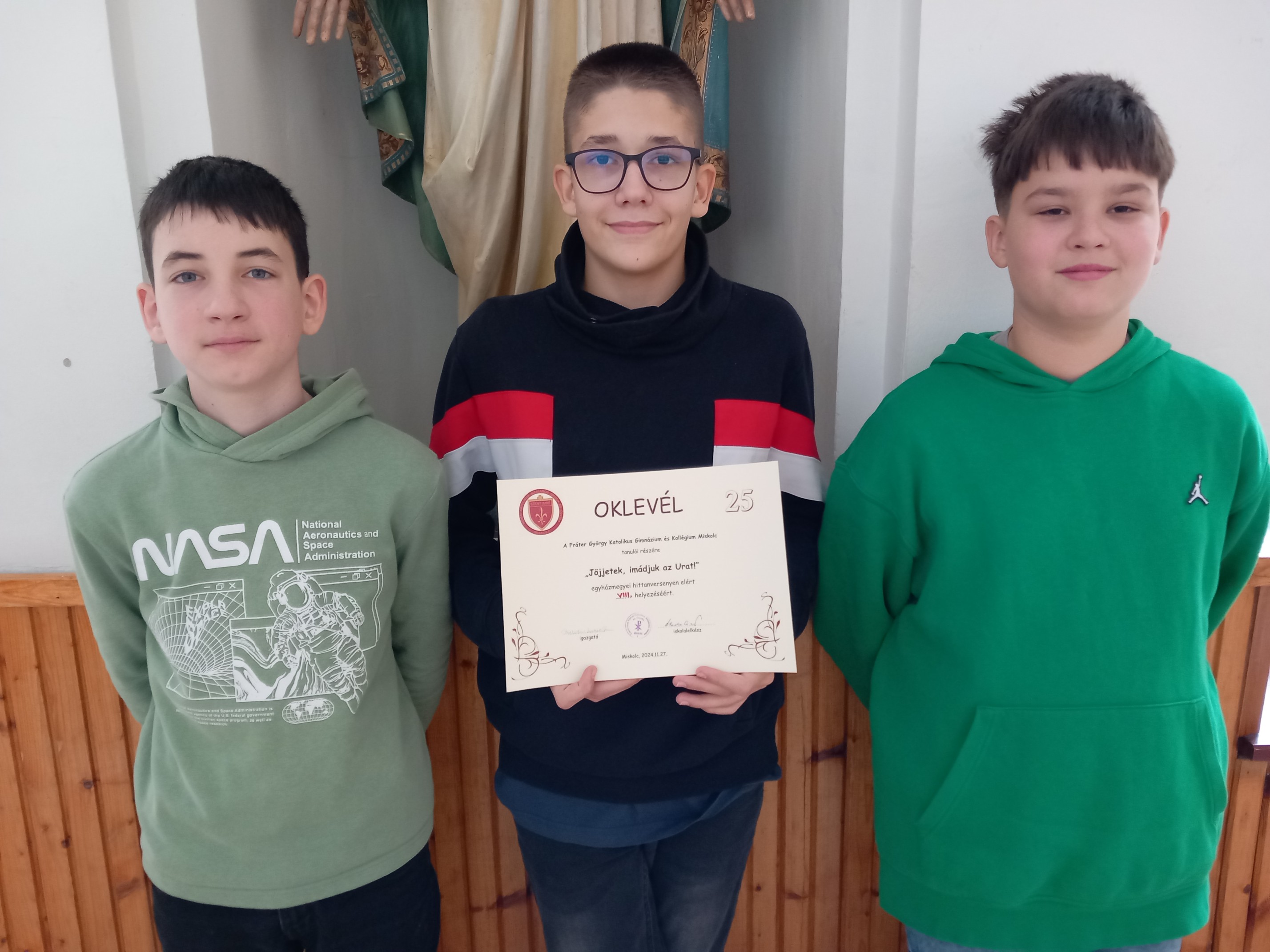 2024. november 27-én a Szent Imre Római Katolikus Általános Iskola és Óvoda által szervezett „Jöjjetek, imádjuk az Urat” egyházmegyei hittanversenyen iskolánk csapata 8. helyezést ért el. A csapat tagjai voltak: Trajter Olivér 7.a (felkészítő tanára: Kuzmáné Juhász Katalin), Farkas Zsombor 7.b és Vanyó Gergő 7.b (felkészítő tanáruk: Bokros Beáta)