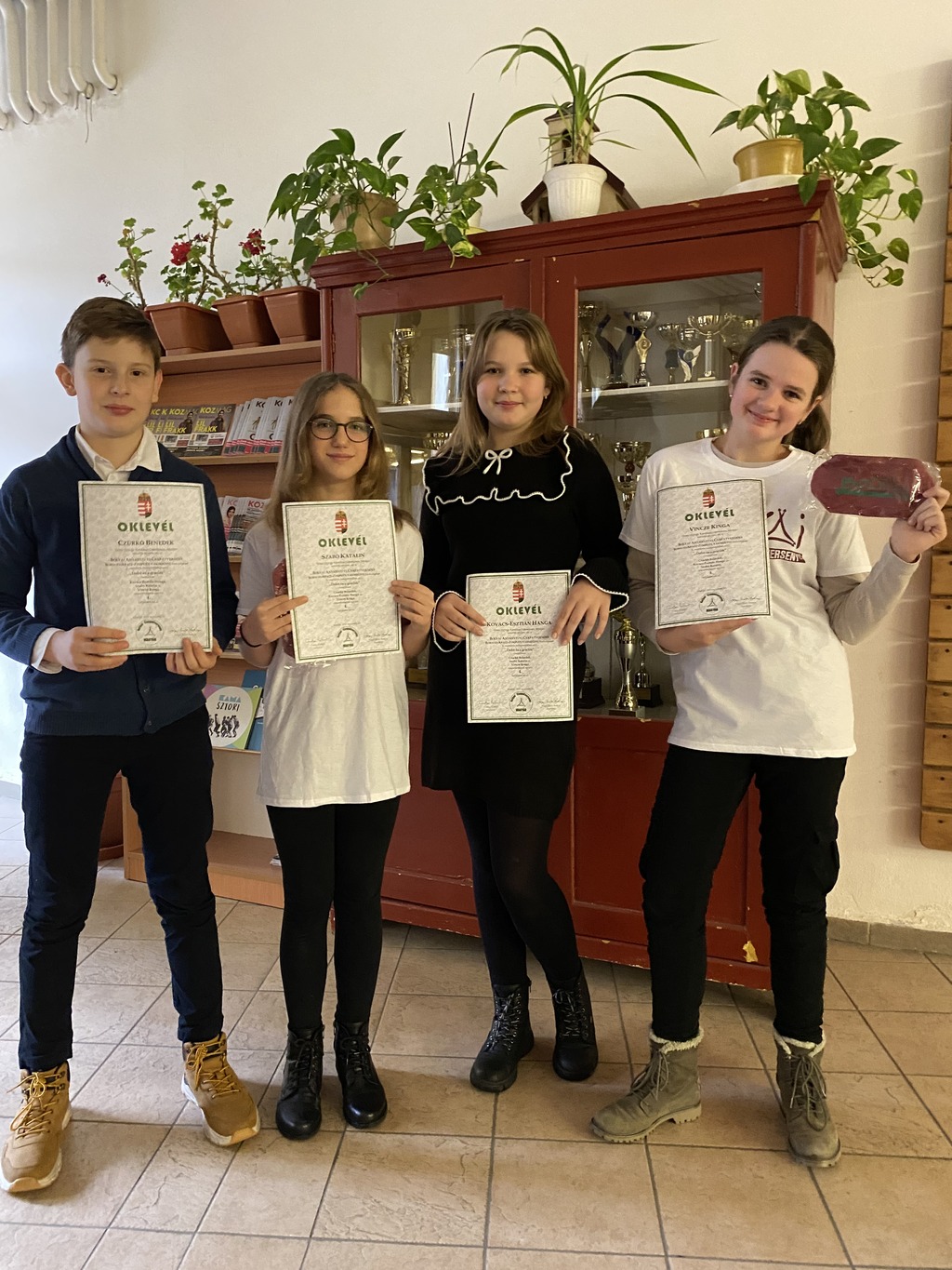 A Bolyai Anyanyelvi Csapatverseny megyei fordulójában iskolánk 6.a osztályos tanulóinak csapata: Czurkó Benedek, Kovács-Esztián Hanga, Szabó Katalin és Vincze Kinga 4. helyezést ért el. Eredményükhöz szívből gratulálunk! Felkészítő tanáruk: Sajgál Mónika